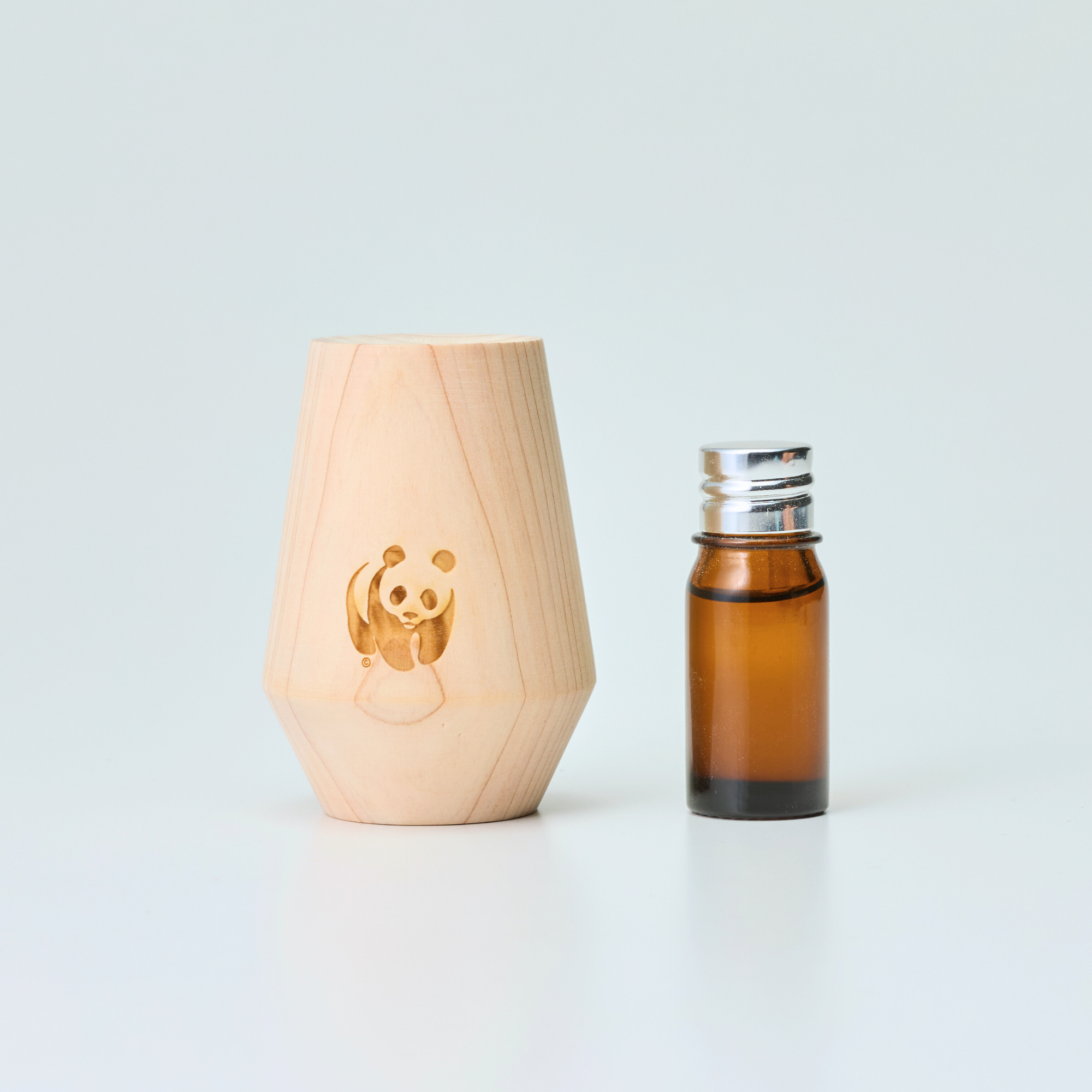 木材工場で生まれた端材やおがくずから抽出・製造したエッセンシャルオイルと、山梨県産ヒノキを一つひとつ手作業で削り出したアロマスタンドのセットです。