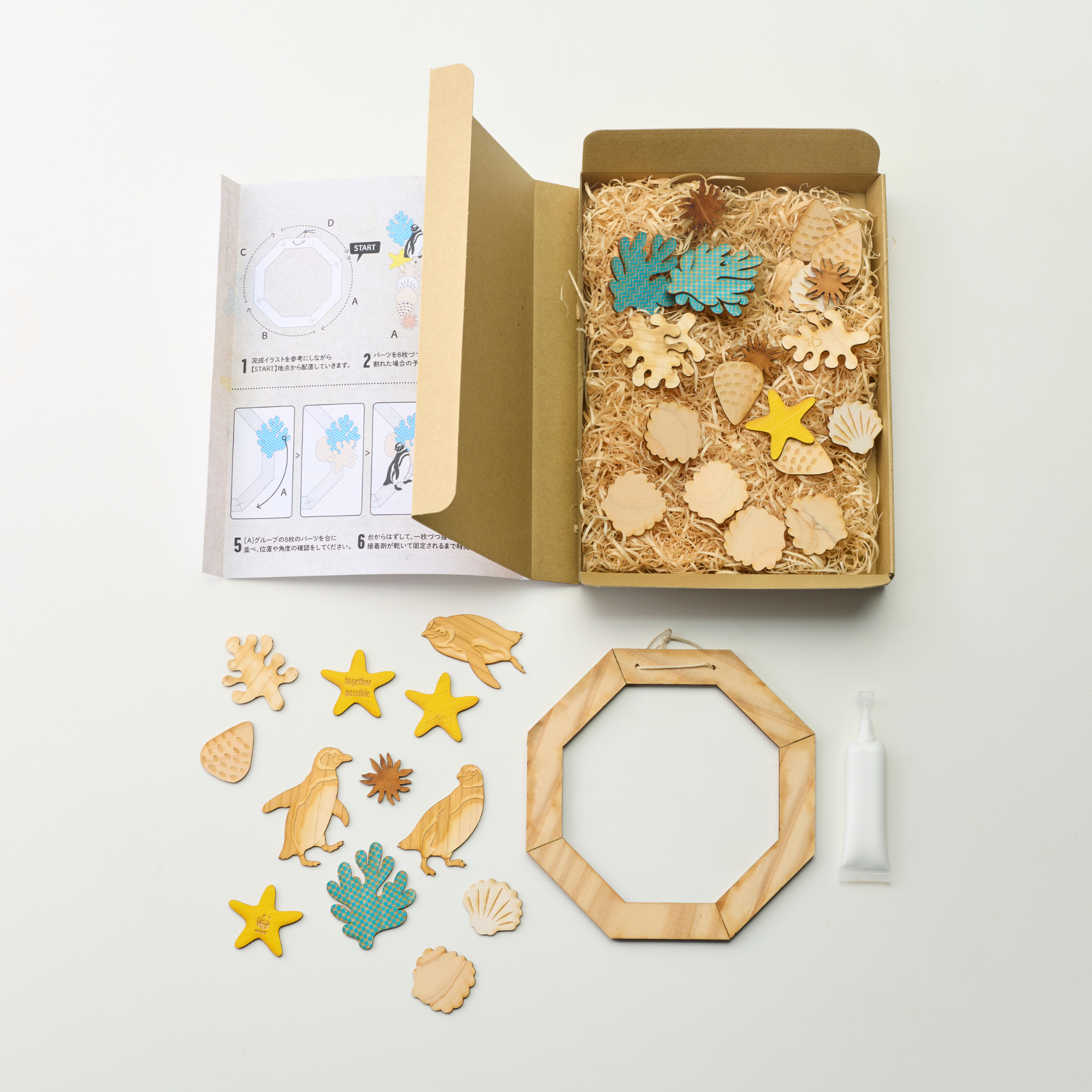 ■ セット内容/パーツ34枚(予備分2枚含む)、マグネット付き土台、木工用ボンド4g、紐、説明書(巻紙裏側) ※緩衝材として木くずを使用